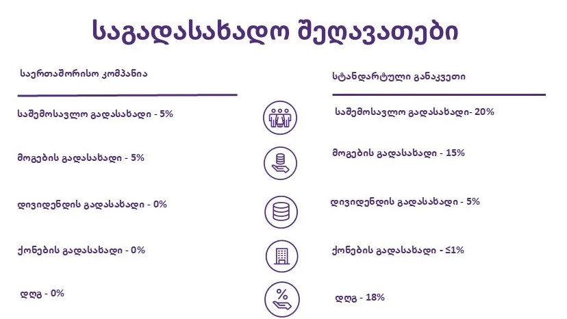 - ⏺საერთაშორისო კომპანიისთვის მოგების გადასახადის განაკვეთი განისაზღვრება მხოლოდ 5%-ით ნაცვლად 15%-ისა.