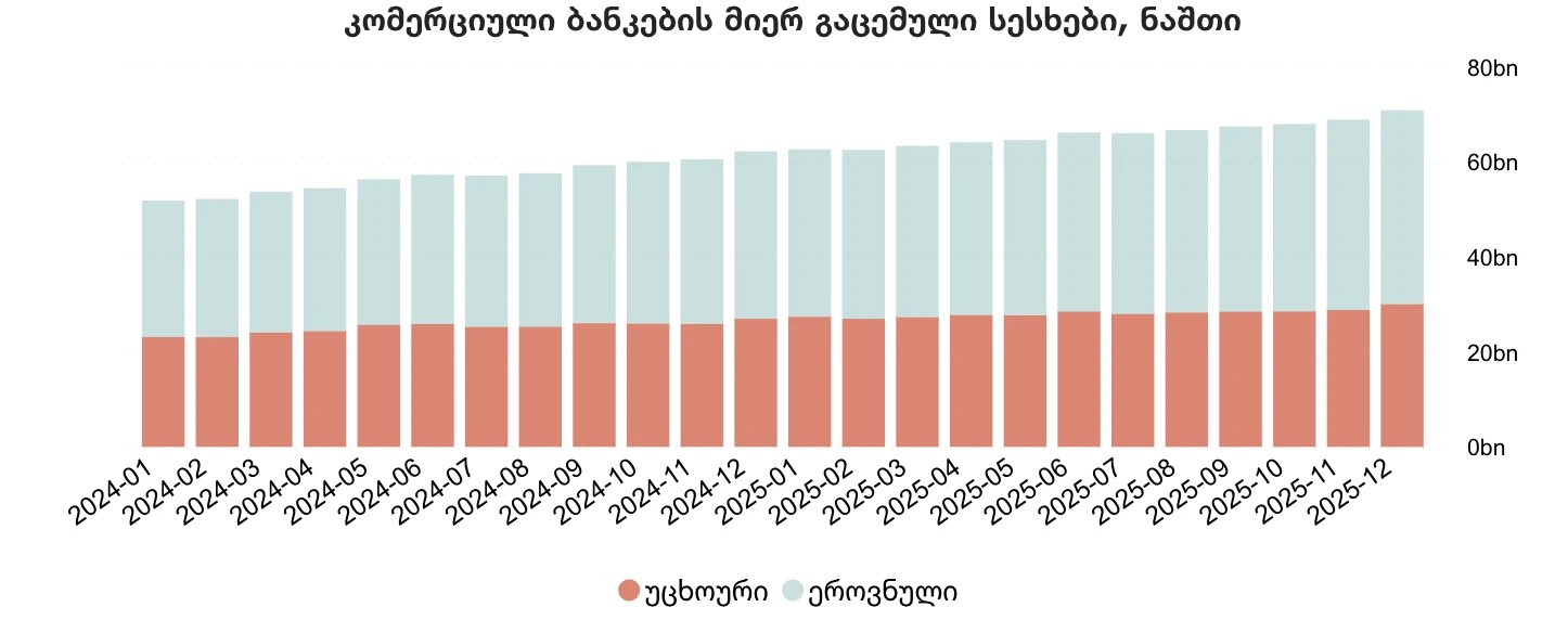კომერციული ბანკების მიერ გაცემული სესხების მოცულობამ (ბანკთაშორისი სესხების გარდა), 2025 წლის დეკემბრის ბოლოსათვის 70.94 მილიარდი ლარი შეადგინა. ეროვნული ბანკის ინფორმაციით, ეს თითქმის 2 მილიარდი ლარით (3%-ით) მეტია ნოემბრის ბოლოს არსებულ მაჩვენებელზე (გაცვლითი კურსის ეფექტის გარეშე, 2.71% -ით მეტი).