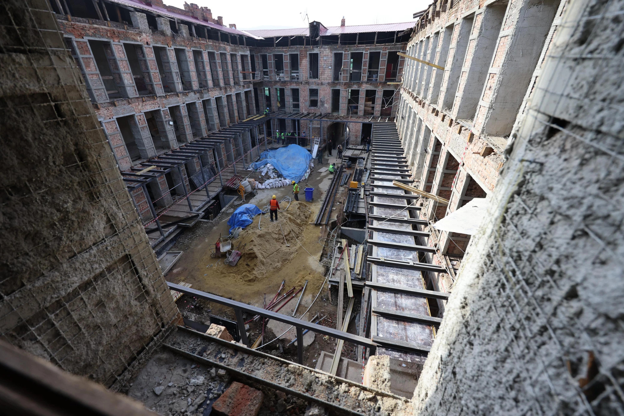 ამ ეტაპზე მიმდინარეობს კედლებისა და ნალესობის დემონტაჟი, შიდა კედლების ლესვა ცემენტის ხსნარით, წინა ფასადზე თაბაშირის დეტალების მონტაჟი, უკანა ეზოში აგურის აღდგენისა და აივნის ლითონკონსტრუქციების შედუღების სამუშაოები.