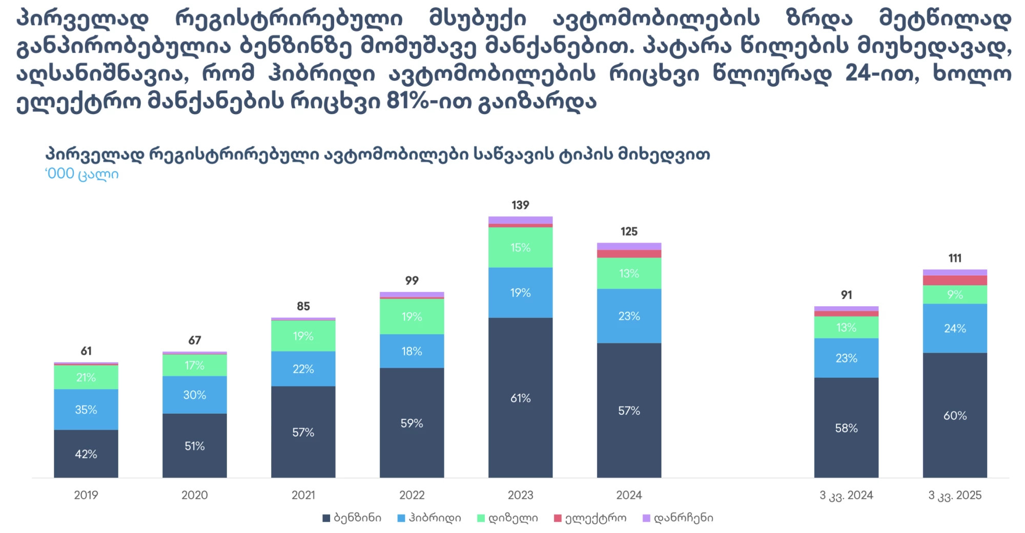 პატარა წილების მიუხედავად, აღსანიშნავია, რომ 2025 წლის პირველ სამ კვარტალში, პირველად რეგისტრაციებში ჰიბრიდი ავტომობილების რიცხვი წლიურად 24%-ით, ხოლო ელექტრო მანქანების რიცხვი წლიურად 81%-ით გაიზარდა, - ამის შესახებ „თიბისი კაპიტალის“ ახალ კვლევაშია აღნიშნული.