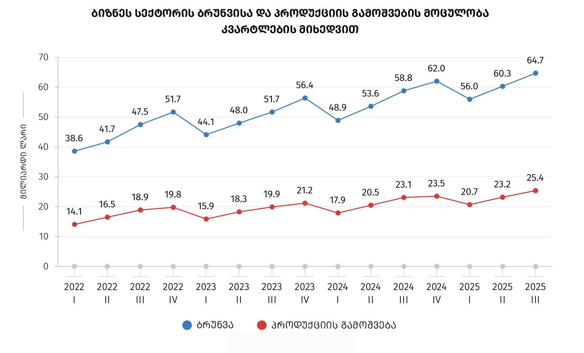 ზრდის ტენდენციით ხასიათდებოდა ბიზნეს სექტორის პროდუქციის გამოშვების მაჩვენებელიც. 2025 წლის III კვარტალში მისი მოცულობა 25.4 მილიარდი ლარით განისაზღვრა, რაც გასული წლის შესაბამისი პერიოდის მაჩვენებელზე 9.7 პროცენტით მეტია.