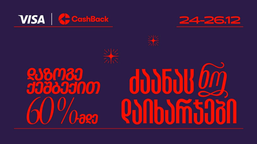 ლიბერთის ლოიალობის პროექტის CashBack-ის და Visa-ს ერთობლივი საახალწლო აქცია დაიწყო. 24-დან - 26 დეკემბრის ჩათვლით, ლიბერთის Visa ბარათის მფლობელებს შესაძლებლობა აქვთ იშოპინგონ საახალწლოდ მათთვის საყვარელ CashBack-ის მეგობარ ობიექტებში და დაიბრუნონ 50%-მდე ქეშბექი მომენტალურად.