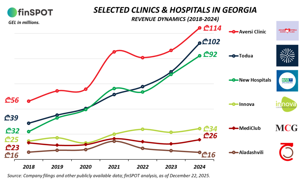 FINSPOT-ის ანგარიშის მიხედვით, 2024 წელს “ავერსის კლინიკის” შემოსავალმა ₾114 მილიონი შეადგინა, “თოდუას კლინიკის” — ₾102 მილიონი, ხოლო “ნიუ ჰოსპიტალსის” — ₾92 მილიონი. ამავე პერიოდში, წარმოდგენილი საშუალო ზომის კლინიკების შემოსავლები ₾15-₾35 მილიონის ფარგლებში მერყეობდა.