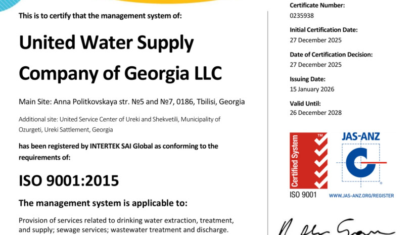 ინფრასტრუქტურის სამინისტროს „საქართველოს გაერთიანებული წყალმომარაგების კომპანიამ“ წარმატებით გაიარა ხარისხის მართვის სისტემის საერთაშორისო აუდიტი და მიიღო ISO 9001:2015 სტანდარტის შესაბამისობის სერტიფიკატი.