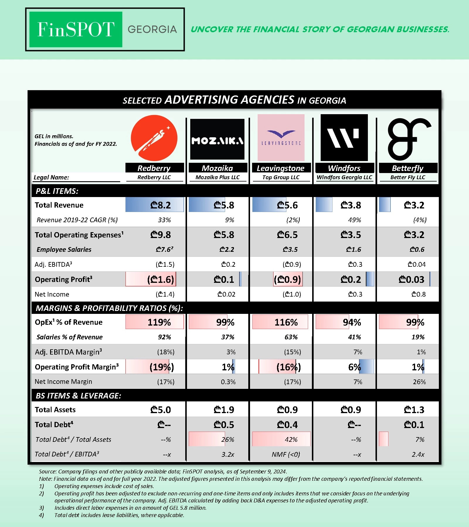 სარეკლამო სააგენტოებს 5 კომპანიის მაგალითზე ორგანიზაცია Finspot გაეცნო. შპს „რედბერი“, შპს „მოზაიკა პლიუსი“, შპს „ტოპ გრუპი“ (Leavingstone), შპს „Windfors Georgia“ და შპს „ბეთერ ფლაის“ ძირითად საქმიანობას წარმოადგენს სარეკლამო დაგეგმარება, მარკეტინგული და საკომუნიკაციო კამპანიების შექმნა, სოციალური მედიის მართვა და ა.შ. რამდენიმე სააგენტო მომხმარებლებს ასევე სთავაზობს ციფრული პროდუქტების განვითარებას.