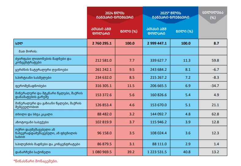 2025 წლის იანვარ-ნოემბერში ადგილობრივი ექსპორტის ათეულში პირველ ადგილზე ძვირფასი ლითონების მადნები და კონცენტრატები არის წარმოდგენილი 339.6 მლნ დოლარით, აღნიშნული სასაქონლო ჯგუფის წილი მთლიანი ადგილობრივი ექსპორტის11.3 პროცენტს შეადგენს. მეორე ადგილზეა ყურძნის ნატურალური ღვინოები, 243.7 მლნ დოლარით (მთლიანი ადგილობრივი ექსპორტის 8.1 პროცენტი), ხოლო მესამე ადგილს იკავებს სპირტიანი სასმელები 215.3 მლნ. აშშ დოლარით (მთლიანი ადგილობრივი ექსპორტის 7.2 პროცენტი)“, - წერია „საქსტატის“ ინფორმაციაში.