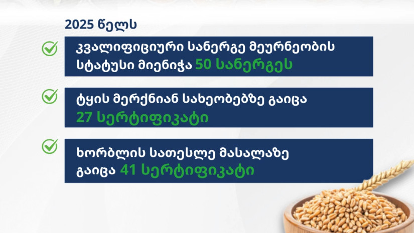 ასევე, 2019–2025 წლების მონაცემებით, ეროვნულ კატალოგში შეტანილია 109 ჯიში, მათ შორის ხორბლის, ვაზის, ქერისა და შვრიის კულტურები, რაც ხელს უწყობს სერტიფიცირებული სათესლე და სარგავი მასალის წარმოების განვითარებასა და აგროსექტორის მდგრადობას.