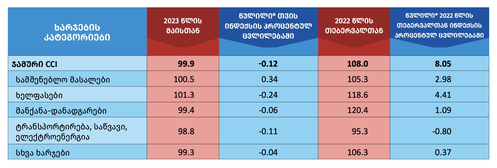 აღნიშნულ პერიოდში ტრანსპორტირების, საწვავისა და ელექტროენერგიის კატეგორიაზე ფასების 1.2 პროცენტიანი კლება დაფიქსირდა, რამაც -0.11 პროცენტული პუნქტი შეიტანა ჯამური ინდექსის ცვლილებაში. ამასთან, სამშენებლო მასალების ფასები 0.5 პროცენტით გაიზარდა, რამაც 0.34 პროცენტული პუნქტით იქონია ზეგავლენა თვის ინდექსზე.