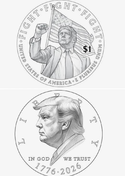 მონეტის წინა მხარეს გამოსახულია ტრამპის პროფილი, ზედა ნაწილში კი სიტყვა- Liberty. მის ქვეშ აღნიშნულია დევიზი In God We Trust, ხოლო ქვედა ნაწილში- 1776–2026 წლები, რაც აშშ-ის დამოუკიდებლობის 250 წლის იუბილეს სიმბოლოა.