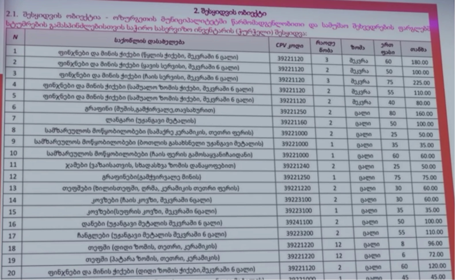 ოზურგეთის მერიისთვის 2000 ლარის ჭურჭელი იყიდეს - ოფიციალურ დოკუმენტებში წერია, რომ შეიძინეს სამზარეულოსთვის საჭირო ჯამებიც და ღრმა თეფშებიც, ფინჯნებიც და ჩაიდნებიც.