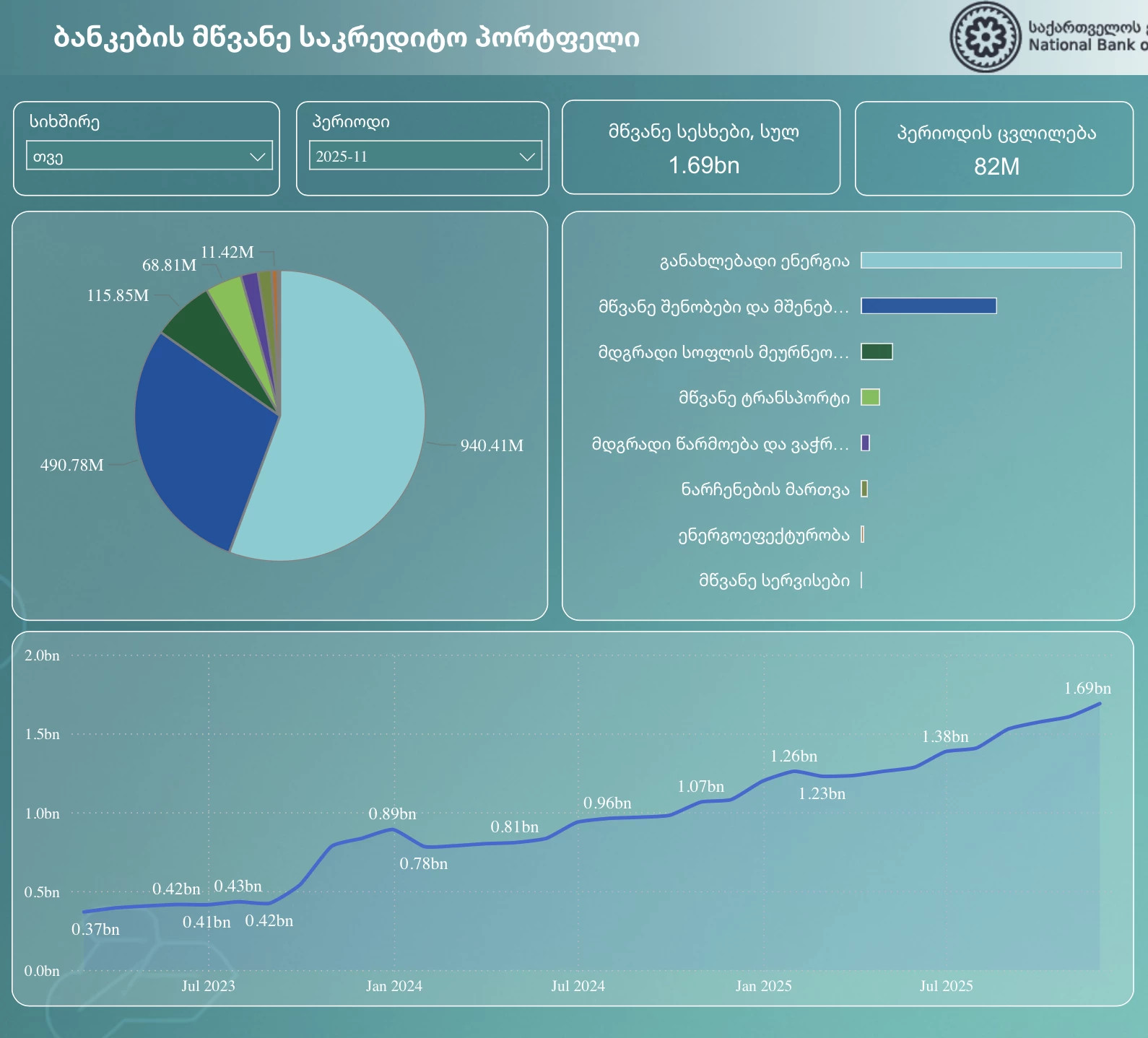 2025 წლის ნოემბრის მონაცემებით საქართველოში 1.69 მილიარდი ლარის მწვანე სესხია გაცემული, - ინფორმაციას ამის შესახებ სებ-ი აქვეყნებს.