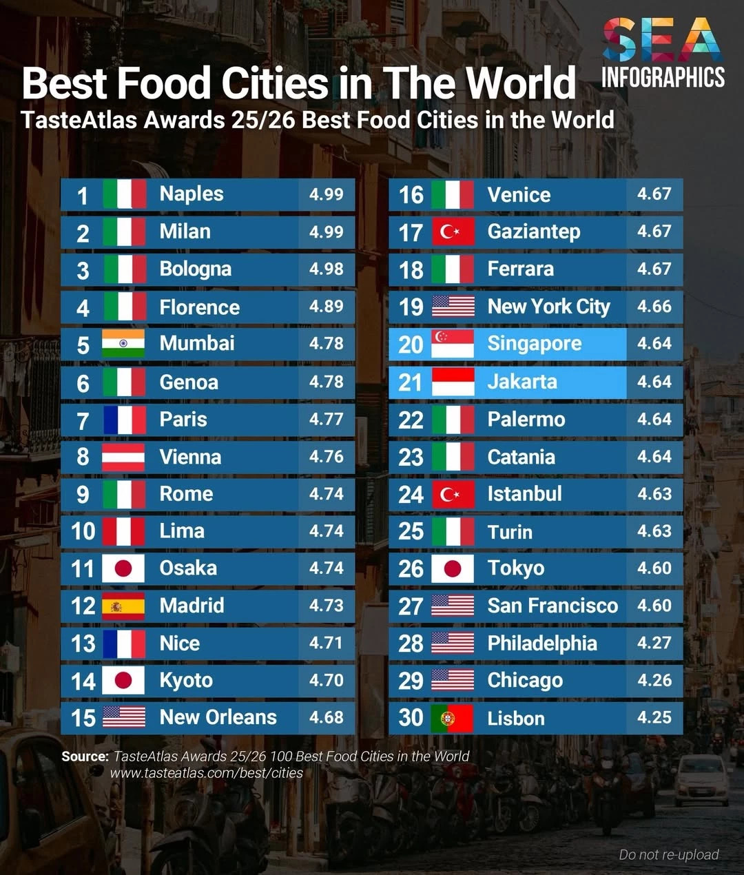 TesteAtlas აღნიშნავს, რომ იტალიური კულინარიული ცენტრებიდან დაწყებული დინამიური აზიური და ამერიკული კულინარიული დანიშნულების ადგილებით დამთავრებული, ეს ქალაქები გამოირჩევიან მდიდარი არომატებითა და მსოფლიო დონის კულინარიული კულტურით.