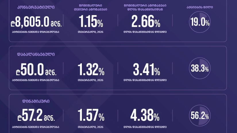 ყველაზე მაღალი, 1.57%-იანი ზრდა დინამიკურმა პორტფელმა დააფიქსირა, ხოლო დაბალანსებული და კონსერვატიული პორტფელების მომგებიანობამ შესაბამისად 1.32% და 1.15% შეადგინა.