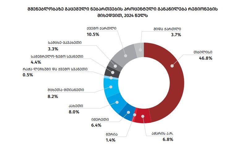 საქსტატის ოფიციალური მონაცემებით, საქართველოში 2024 წელს გაცემულია 12 080 ნებართვა (წინა წელთან შედარებით 7.1 პროცენტით მეტი) 12 040.4 ათასი კვ.მ ფართობის (წინა წელთან შედარებით 28.4 პროცენტით მეტი) შენობა-ნაგებობების მშენებლობაზე. ნებართვების 73.5 პროცენტი მოდის ქვეყნის 4 რეგიონზე, კერძოდ, ჩასატარებელი სამშენებლო სამუშაოების 46.8 პროცენტი მოდის თბილისზე, 10.5 პროცენტი - ქვემო ქართლის რეგიონზე, 8.2 პროცენტი - მცხეთა-მთიანეთის რეგიონზე და 8.0 პროცენტი - კახეთის რეგიონზე.