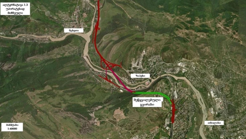 - ალტერნატივა 2: ზედაპირული გზა მცირე ესტაკადებით მტკვრის ხეობის გვერდის ავლით — შედარებით იაფი, თუმცა აღნიშნულ შემთხვევაში გზა ეკოლოგიურად მგრძნობიარზე ზონას გადაკვეთს.