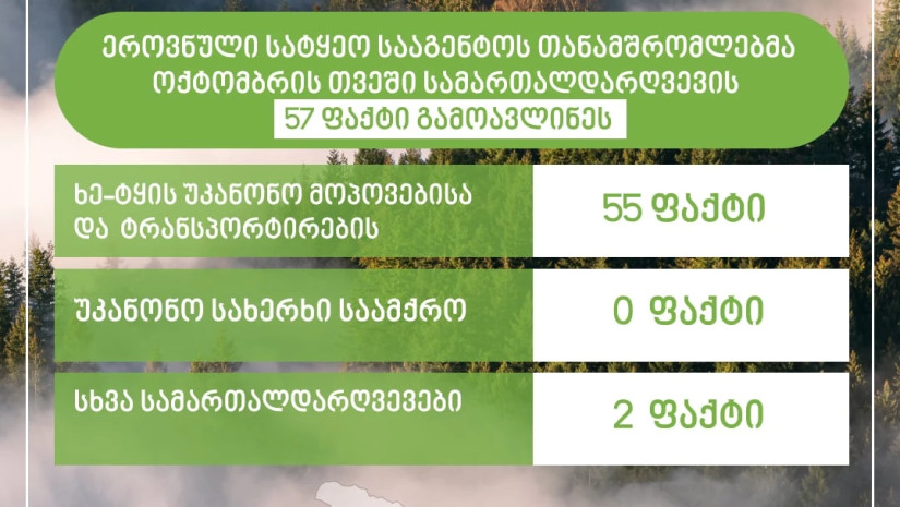 აღსანიშნავია, რომ 2025 წლის იანვარ-ოქტომბრის თვეში, ეროვნული სატყეო სააგენტოს თანამშრომლების მიერ, ჯამში, ქვეყნის მასშტაბით, ხე-ტყის უკანონო მოპოვებისა და ტრანსპორტირების 510 ფაქტია გამოვლენილი; „საქმიან ეზოებში“ დასაწყობებული რესურსის მოცულობამ 1350 კუბური მეტრი შეადგინა. ამავე პერიოდში, ეროვნული სატყეო სააგენტოს თანამშრომლების მიერ, ქვეყნის მასშტაბით გამოვლენილია სახელმწიფო ტყის ფონდის თვითნებურად დაკავების 56 ფაქტი“ - ნათქვამია ინფორმაციაში.