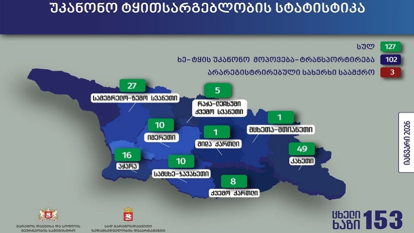 გარემოს დაცვისა და სოფლის მეურნეობის სამინისტროს გარემოსდაცვითი ზედამხედველობის დეპარტამენტის თანამშრომლებმა, 2026 წლის 01 იანვრიდან 31 იანვრის ჩათვლით პერიოდში, უკანონო ტყითსარგებლობის 127 ფაქტი გამოავლინეს.