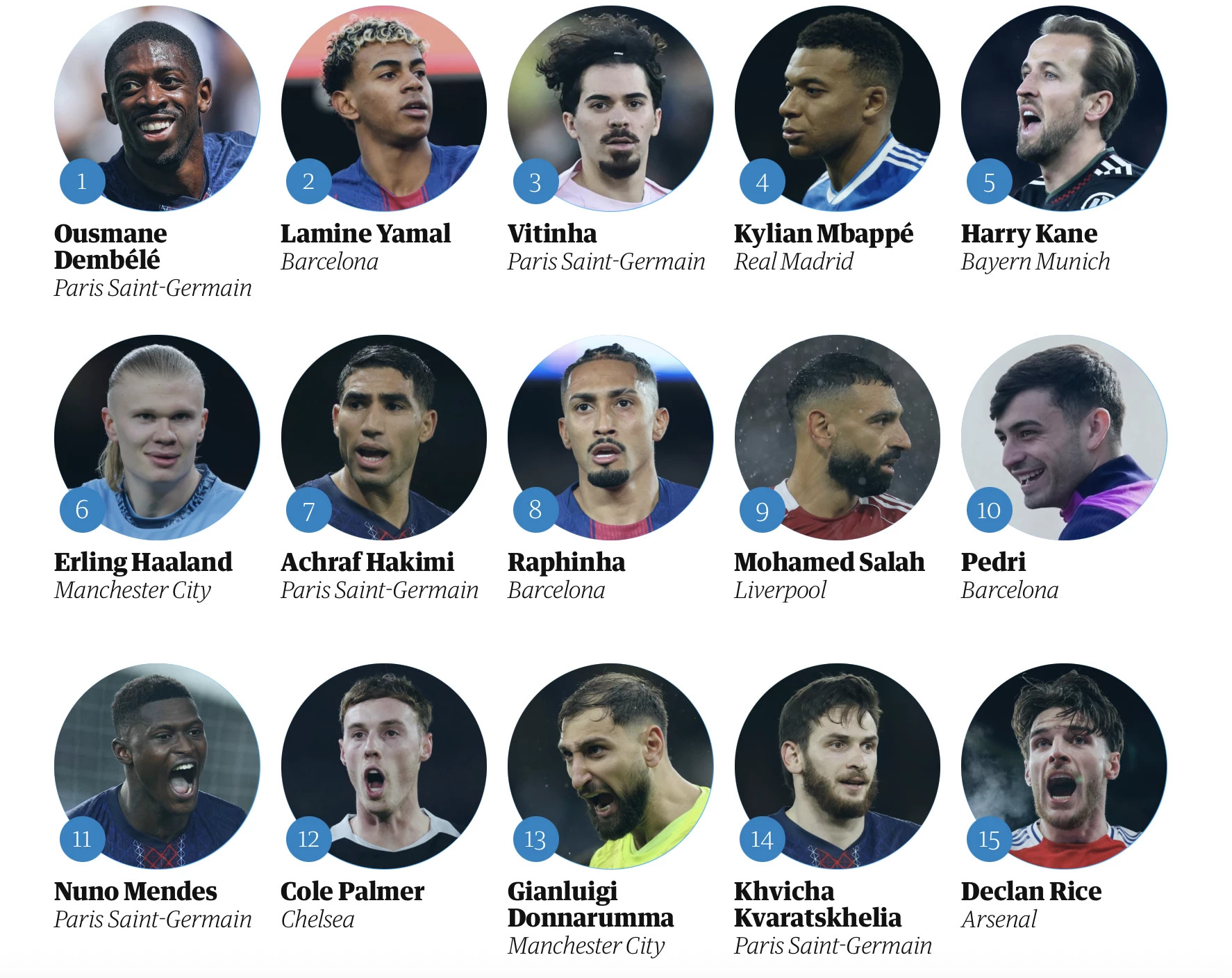 ბრიტანულმა გამოცემა The Guardian-მა 2025 წლის მსოფლიოს 100 საუკეთესო ფეხბურთელის სია გამოაქვეყნა. ჩამონათვალში „პარი სენ-ჟერმენის“ ქართველმა ფეხბურთელმა ხვიჩა კვარაცხელიამ მე-14 ადგილი დაიკავა.