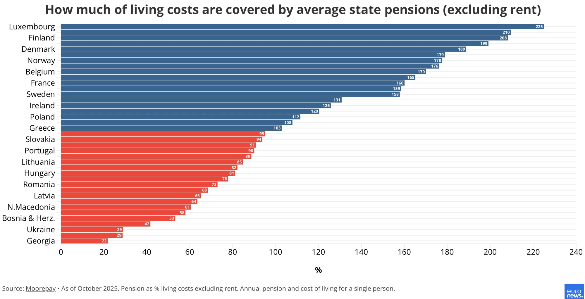 მაგალითად, ლუქსემბურგში სახელმწიფო პენსიის საშუალო ოდენობა 28,790 ევროა, ხოლო ცხოვრების ღირებულება 12,791 ევროა. შედეგად, რჩება 15,989 ევროს ოდენობის ნაშთი. ეს ნიშნავს, რომ სახელმწიფო პენსია ცხოვრების ღირებულებაზე ორჯერ მეტია.