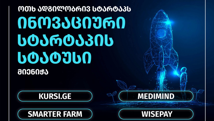 ინოვაციური სტარტაპის სტატუსის მფლობელები ეკონომიკისა და მდგრადი განვითარების სამინისტროს ინოვაციების და ტექნოლოგიების სააგენტოს სტარტაპები Medimind, Kursi.ge, WisePay და Smarter Farm გახდნენ. სტარტაპები ეწევიან ინოვაციური და გლობალური პოტენციალის მქონე საქმიანობას.