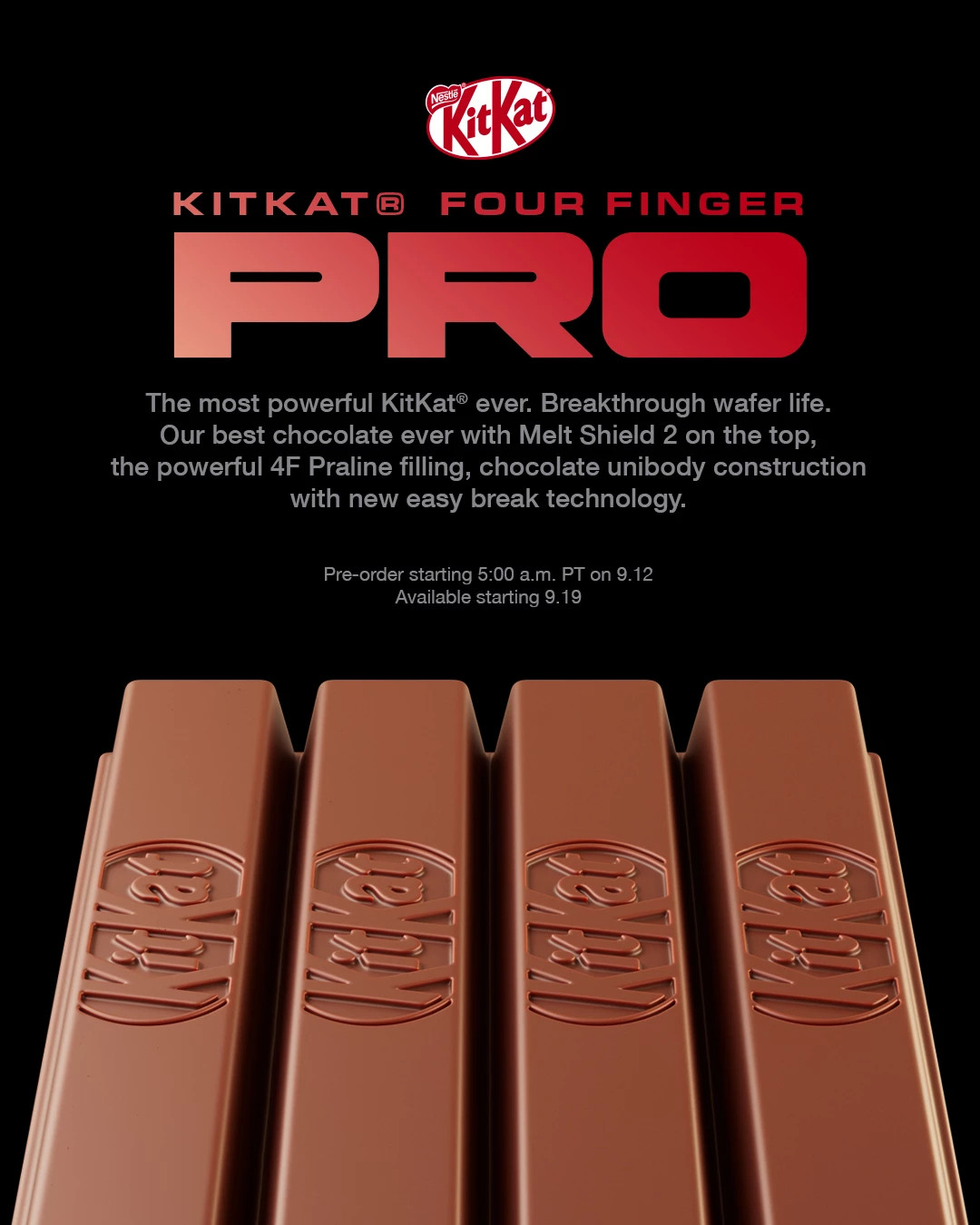 KitKat ახალი iPhone 17 Pro-ს ირგვლივ ატეხილ აჟიოტაჟს გამოეხმაურა და თავადაც შემოგვთავაზა Four Finger Pro შოკოლადი. სოციალურ არხებში გაზიარებულ პაროდიაში მინიმალისტურ, უნაკლო გამოსახულებას ვხედავთ, რომელიც ეფლის პროდუქტების ფოტოებს მოგაგონებთ. თუმცა აქ კამერისა და ბატარეის ნაცვლად, შოკოლადის კორპუსს, მარტივად ტეხვად ტექნოლოგიასა და მდნარ საფარს გვპირდებიან. იმას, რითიც ბრენდი ათწლეულების მანძილზე ამაყობდა: