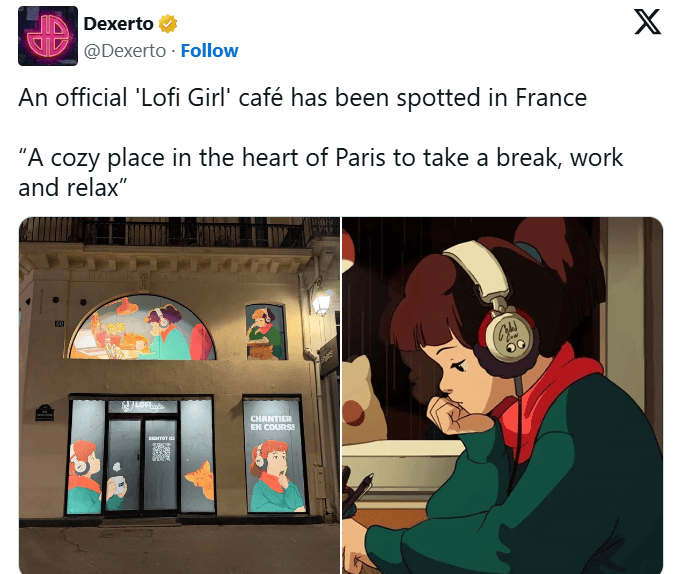 თუ ოდესმე YouTube-ზე ჩართული მშვიდი მუსიკის ფონზე გიმეცადინია ან გიმუშავია, ხოლო მონიტორიდან გოგონას ანიმაცია გიყურებდა, რომელიც კატასთან ერთად ზის, მაშინ იცი, რა არის Lofi Girl. ეს არის არხი YouTube-ზე, რომელიც ცნობილია უწყვეტი სტრიმებით. მალე ამ ციფრულ ატმოსფეროს ეკრანს გარეთ, რეალურ სივრცეში გადმოიტანენ პარიზში და „ონლაინრიტუალს” ისეთ ადგილად აქცევენ, სადაც მართლა შეგიძლია ჩამოჯდე ესპრესოს ჭიქით ხელში. Lofi Girl პარიზში თავისი პირველი ფიზიკური კაფეს გახსნას გეგმავს.