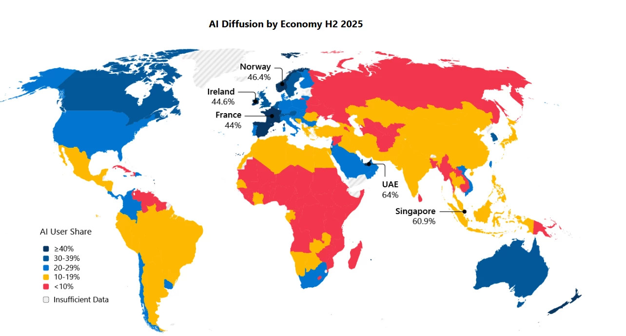 რეიტინგის სათავეში ლიდერობას კვლავ არაბთა გაერთიანებული საამიროები ინარჩუნებს - 2025 წლის ბოლოს AI-ს იყენებდა შრომისუნარიანი მოსახლეობის 64%, რაც წინა ნახევარ წელთან შედარებით ზრდას ნიშნავს. მეორე ადგილზეა სინგაპური (60.9%), შემდეგ კი ნორვეგია, ირლანდია, საფრანგეთი და ესპანეთი.