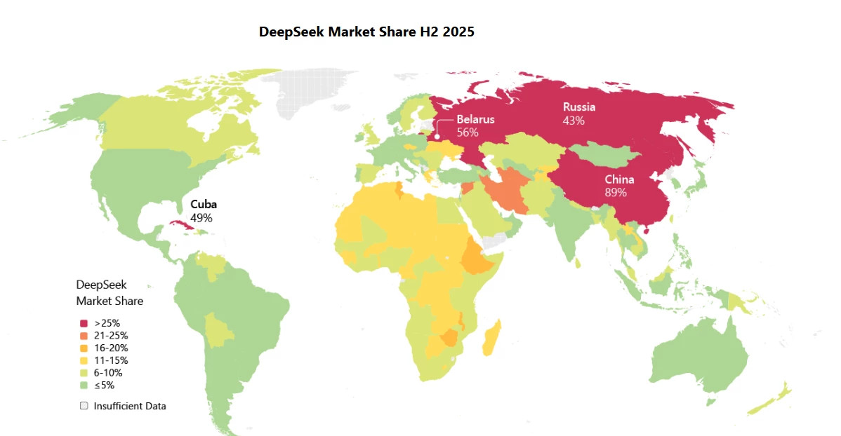 გლობალურ ბაზარზე კიდევ ერთი მნიშვნელოვანი ტენდენცია გახდა ჩინური ღია კოდის პლატფორმის - DeepSeek-ის სწრაფი ზრდა. MIT ლიცენზიით გამოქვეყნებულმა მოდელმა და სრულიად უფასო ჩატბოტმა მნიშვნელოვნად შეამცირა ფინანსური და ტექნიკური ბარიერები. შედეგად, DeepSeek განსაკუთრებით პოპულარული გახდა აფრიკაში, ჩინეთში, რუსეთში, ირანში და სხვა ბაზრებზე, სადაც დასავლური AI პლატფორმების ხელმისაწვდომობა შეზღუდულია. ექსპერტების შეფასებით, ეს ტენდენცია აჩვენებს, რომ AI-ის გლობალური გავრცელება სულ უფრო მეტად დამოკიდებულია ხელმისაწვდომობაზე და არა მხოლოდ ტექნოლოგიურ უპირატესობაზე.