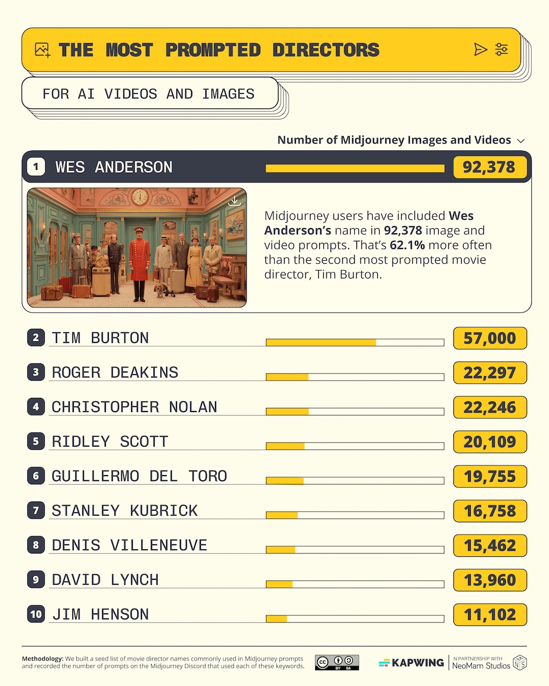რა ხდება, როცა მილიონობით ადამიანი კომპიუტერს ხელოვნების შექმნას სთხოვს? სწორედ ეს კითხვა დასვეს ონლაინ კონტენტის შექმნის პლატფორმა Kapwing-ის უახლესი კვლევის ფარგლებში, რომელიც თითქმის ხუთ მილიონ Midjourney-ის მოთხოვნას მოიცავდა და გამოავლინა კიდეც, თუ რომელი არტისტები, არქიტექტორები და პოპკულტურის წარმომადგენლები გვხვდება პასუხებში ყველაზე ხშირად.