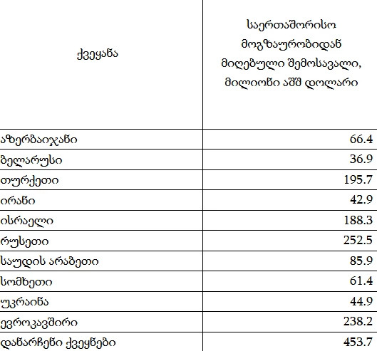 სტატისტიკის მიხედვით, მაღალი ზრდის ტემპით გამოირჩევა აზერბაიჯანიდან და ისრაელიდან მიღებული შემოსავლები, შესაბამისი 36.3% და 28%-იანი წლიური ზრდის ტემპებით.