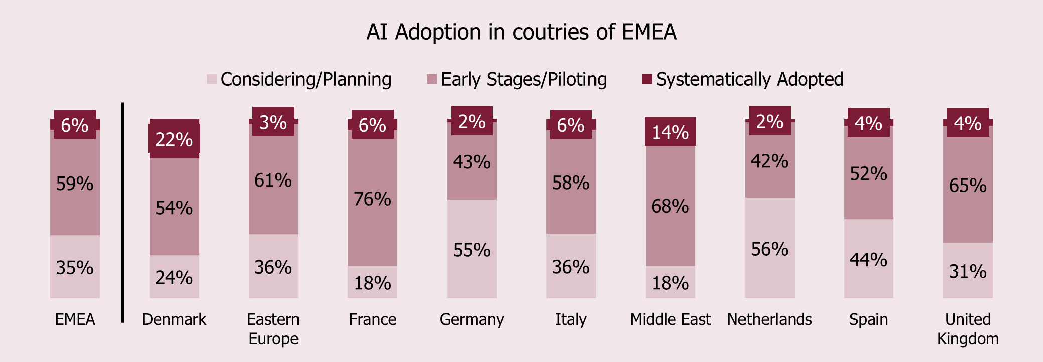 გარდა ამისა, EMEA რეგიონში იზრდება ინტერესი AI-სთან დაკავშირებული პროფესიული მომსახურებების მიმართ: გამოკითხულთა 27% გეგმავს მათი გამოყენების გაზრდას, ხოლო დანარჩენი 72% ან კვლავ იკვლევს ან უკვე გეგმავს მსგავსი ინსტრუმენტების დანერგვას.