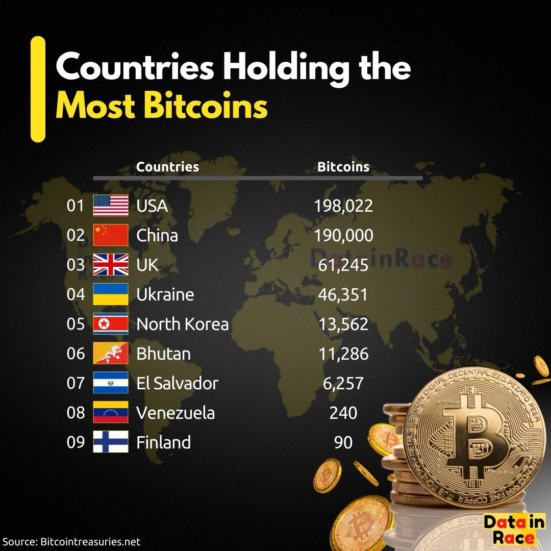 2025 წლის მონაცემებით, ბიტკოინის ყველაზე მეტი რეზერვი აშშ-ს აქვს და ის 198 022-ს შეადგენს , მეორე ადგილზეა ჩინეთი, მესამეზე კი დიდი ბრიტანეთი.
