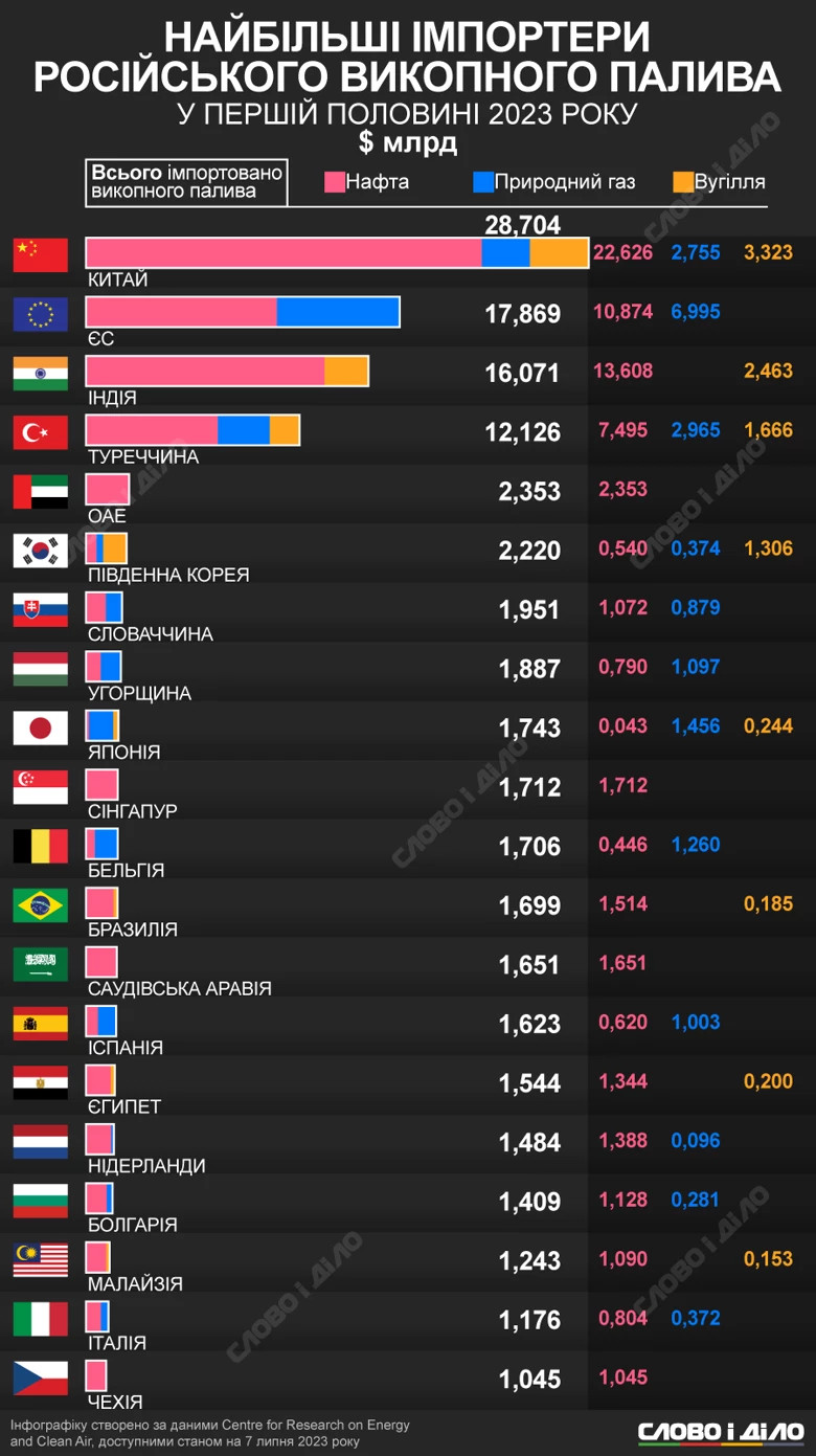 ენერგიის ექსპორტი ყოველთვის იყო რუსული ექსპორტისა და რუსეთის სახელმწიფო ბიუჯეტის მთავარი მამოძრავებელი ძალა. სწორედ გაზის ექსპორტით ცდილობდა პუტინი ევროპის შანტაჟს და სწორედ ეკონომიკის ამ სექტორში იყო ყველაზე რთული სანქციების დაწესება. თუმცა, დასავლეთმა შეძლო მთელი რიგი შეზღუდვების დაწესება ნავთობისა და გაზის მიწოდებაზე და ახლა რუსეთი იძულებულია ეძებოს ახალი ბაზრები თავისი პროდუქციის გასაყიდად. იმ ქვეყნების ინფოგრაფიკას, რომლების რუსული წიაღისეულის ნავთობის მთავარი მყიდველები იყვნენ, უკრაინული მედია ავრცელებს.