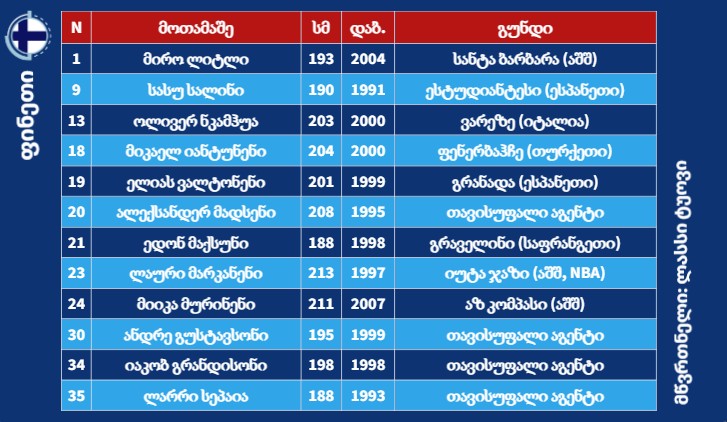 ფინეთს ჰყავს ლაური მარკანენი, NBA-ს დონის ფორვარდი, მაგრამ ვერც მარკანენი და ვერც მუურინენ-ლეჰტონენი საქართველოსთან უპირატესობას ვერც ახლა მოიპოვებენ და არც ადრე მოუპოვებიათ. მიზეზი: ადრე ჩვენს ნაკრებში ზაზა ფაჩულია და გიორგი შერმადინი თამაშობდნენ, ახლა – ბითაძე, შერმადინი, შენგელია, მამუკელაშვილი და ბურჯანაძე.
