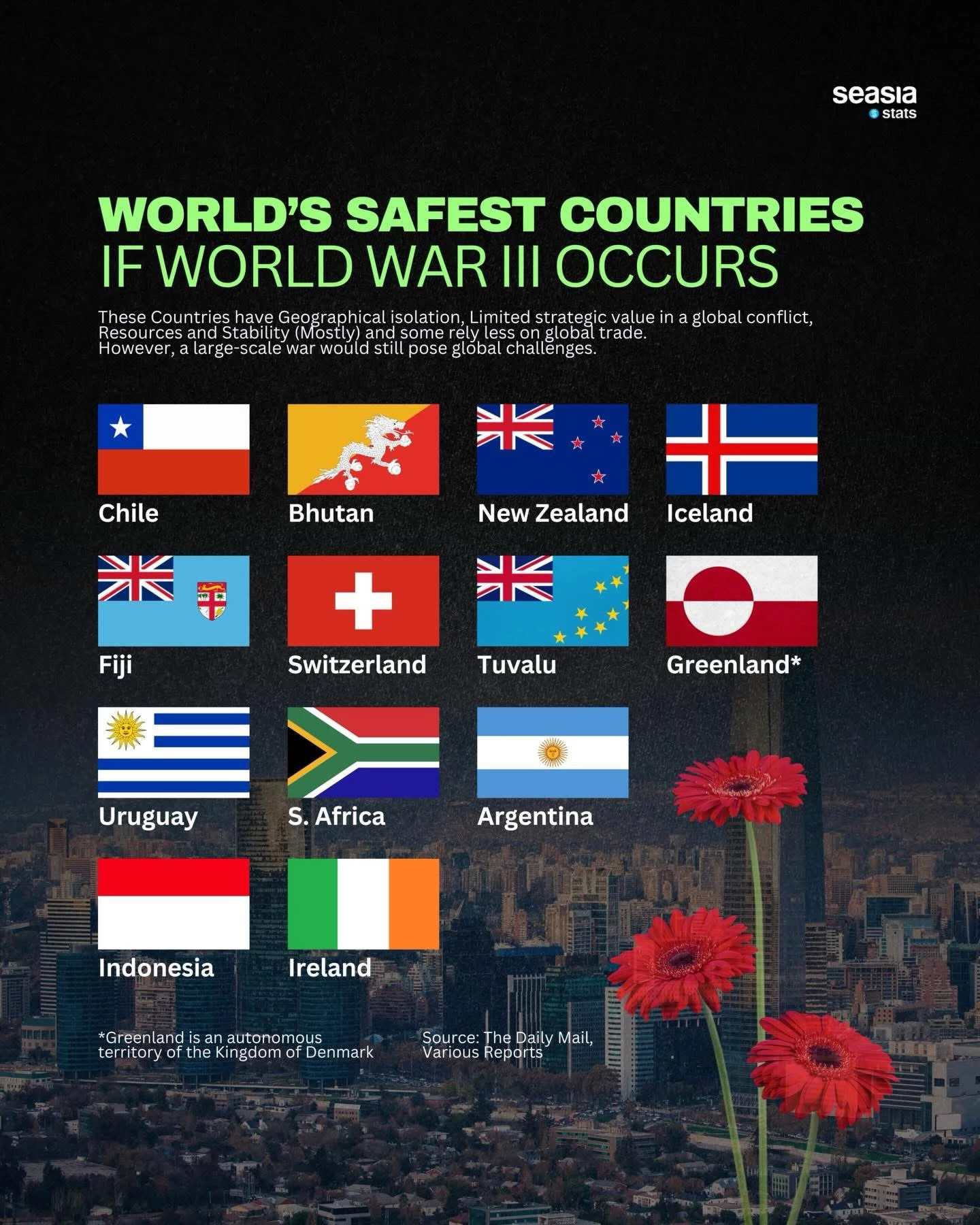 The Daily Mail-ისა და სხვადასხვა ანგარიშის ბოლოდროინდელმა მიმოხილვამ გამოკვეთა რამდენიმე სახელმწიფო, რომლებიც მიიჩნევა მსოფლიოში ყველაზე უსაფრთხოდ მასშტაბური გლობალური კონფლიქტის ან III მსოფლიო ომის დაწყების შემთხვევაში.